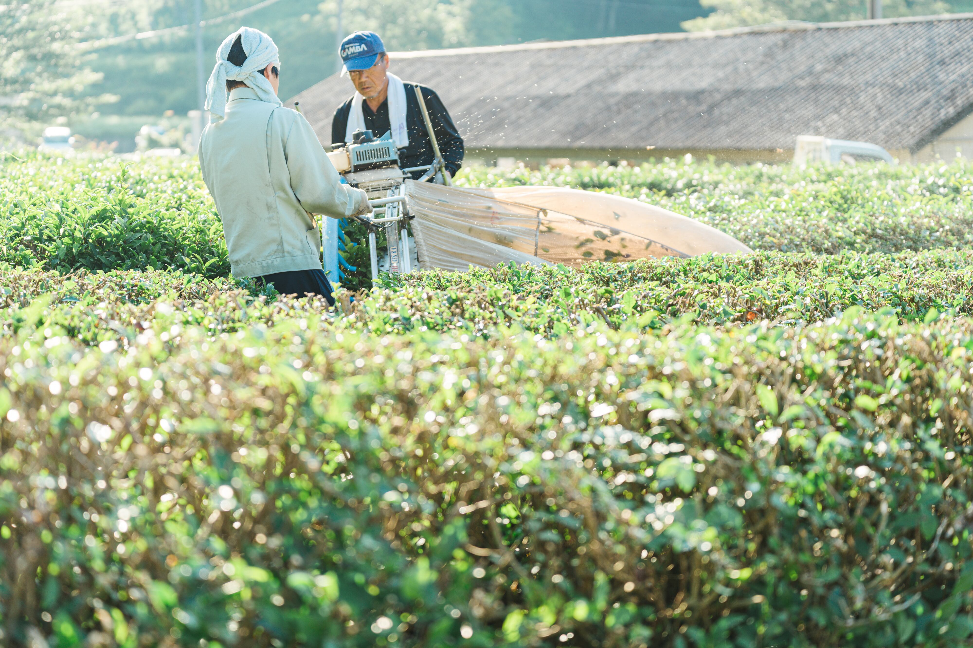 ①夏まで大きく育ったお茶の葉を枝ごと刈り取る。