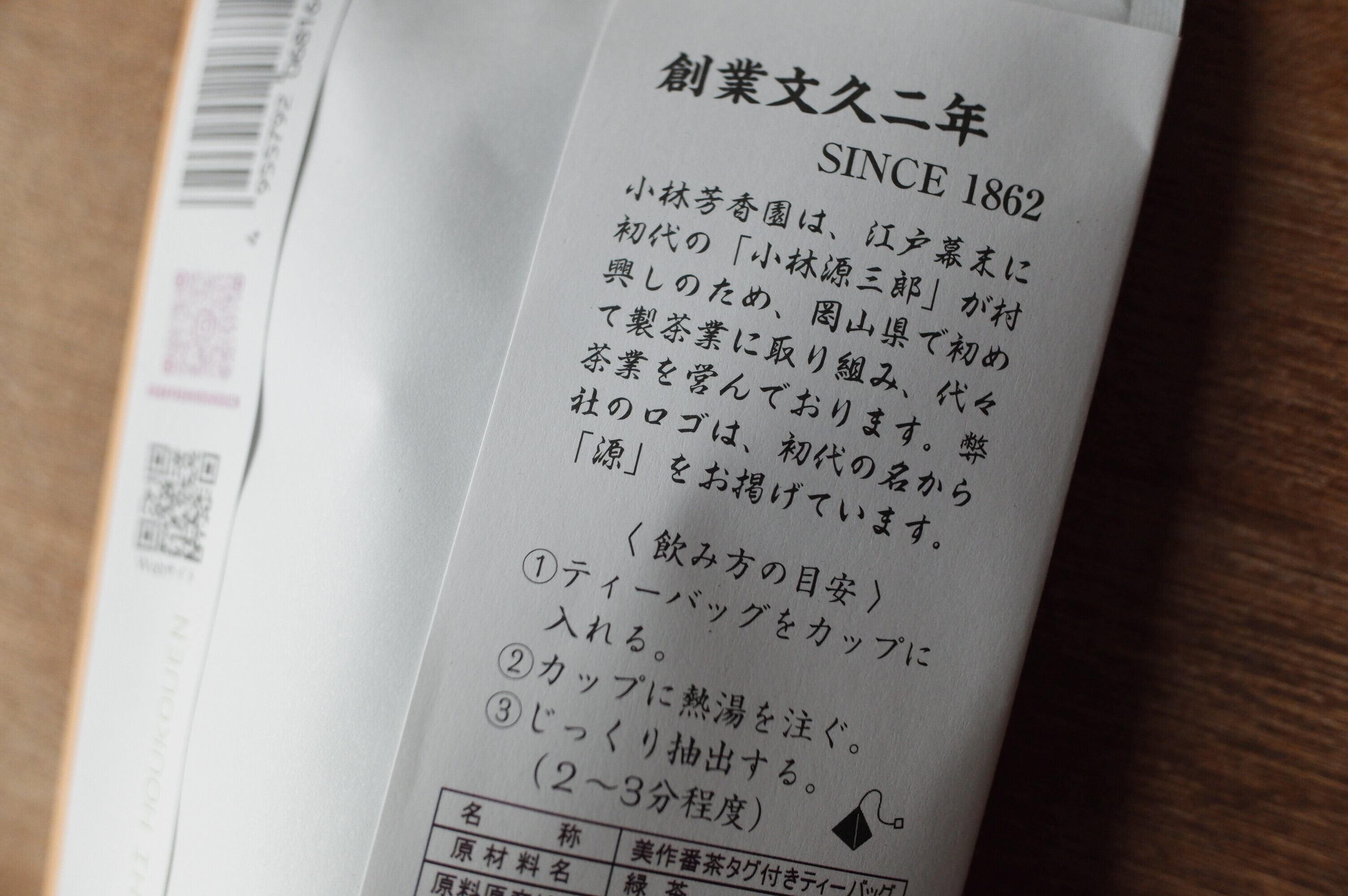 美作(みまさか)の地にて製茶業を営まれている小林芳香園さんの美作番茶です。
