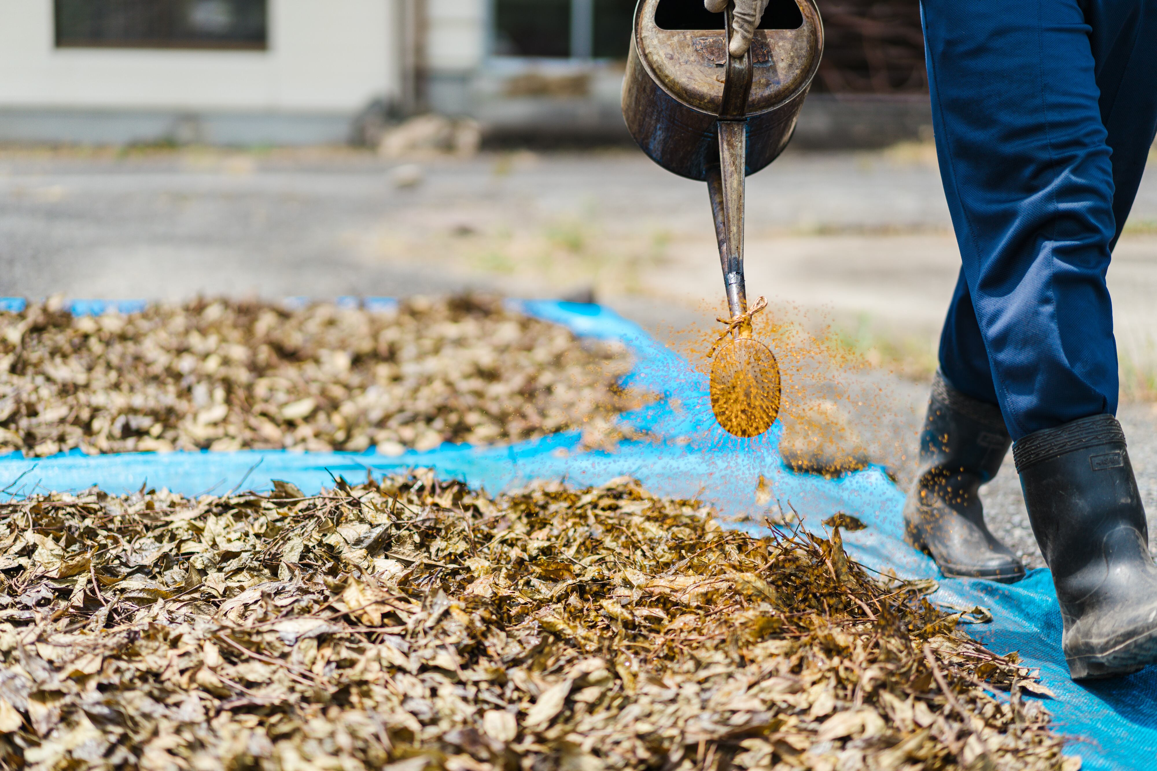 ④お茶の葉を煮た時の煮汁をまんべんなく繰り返しかけ、再び炎天で乾燥させる。