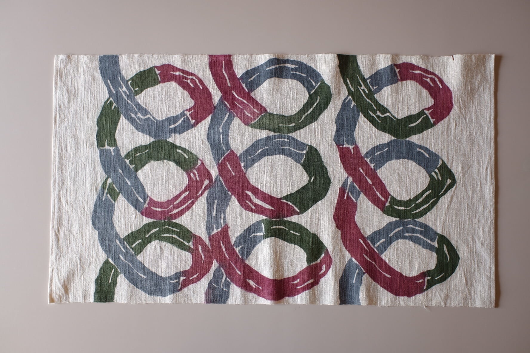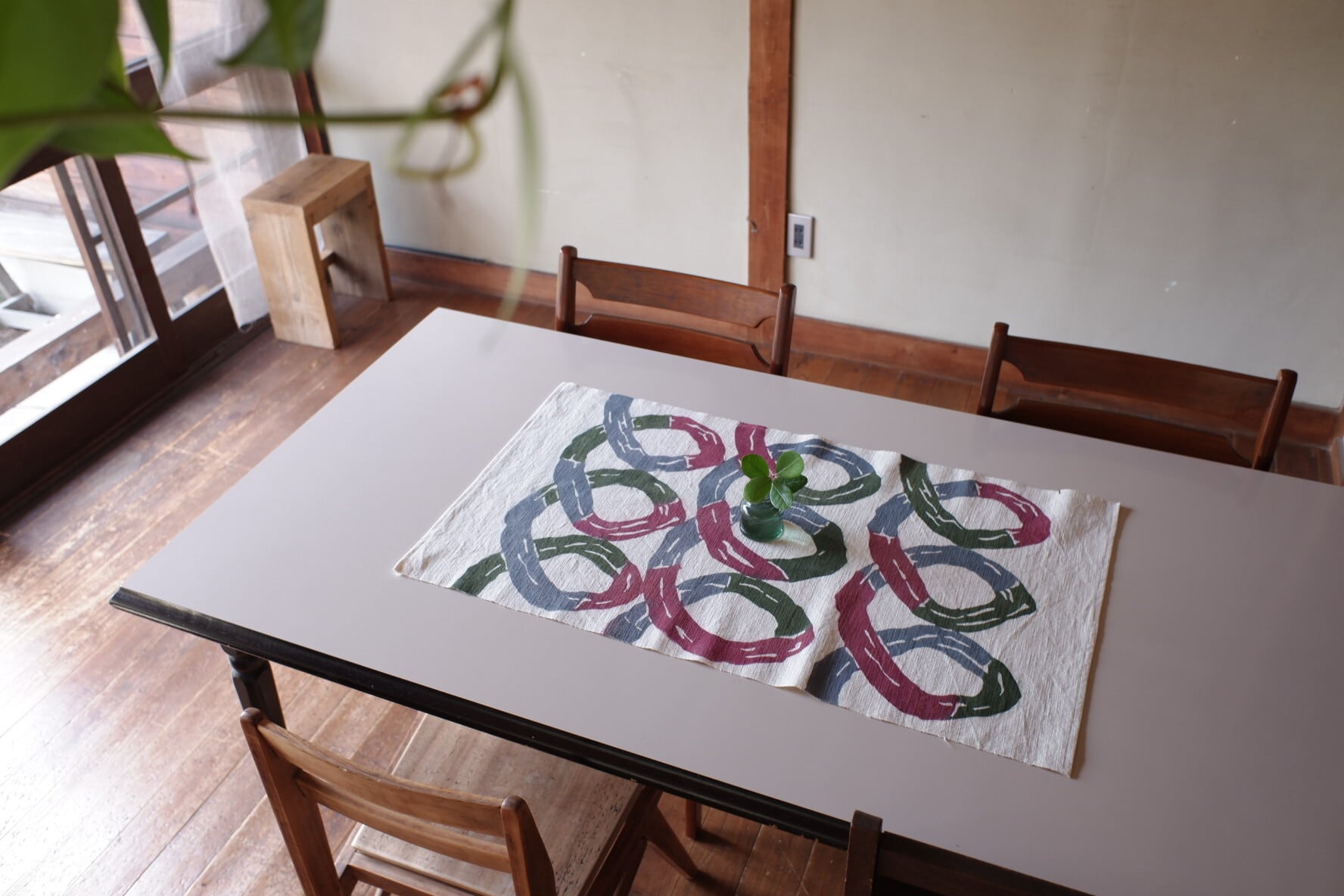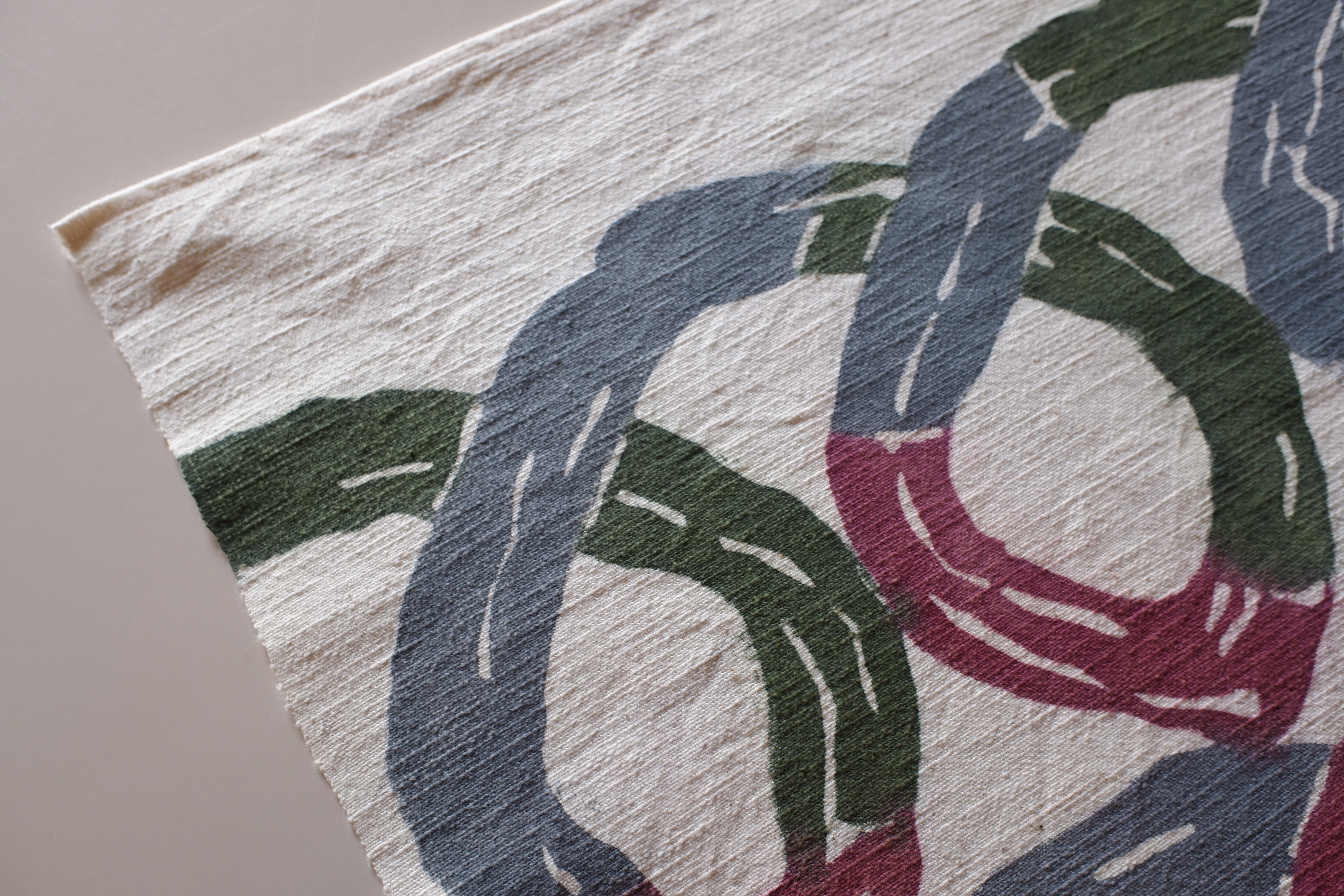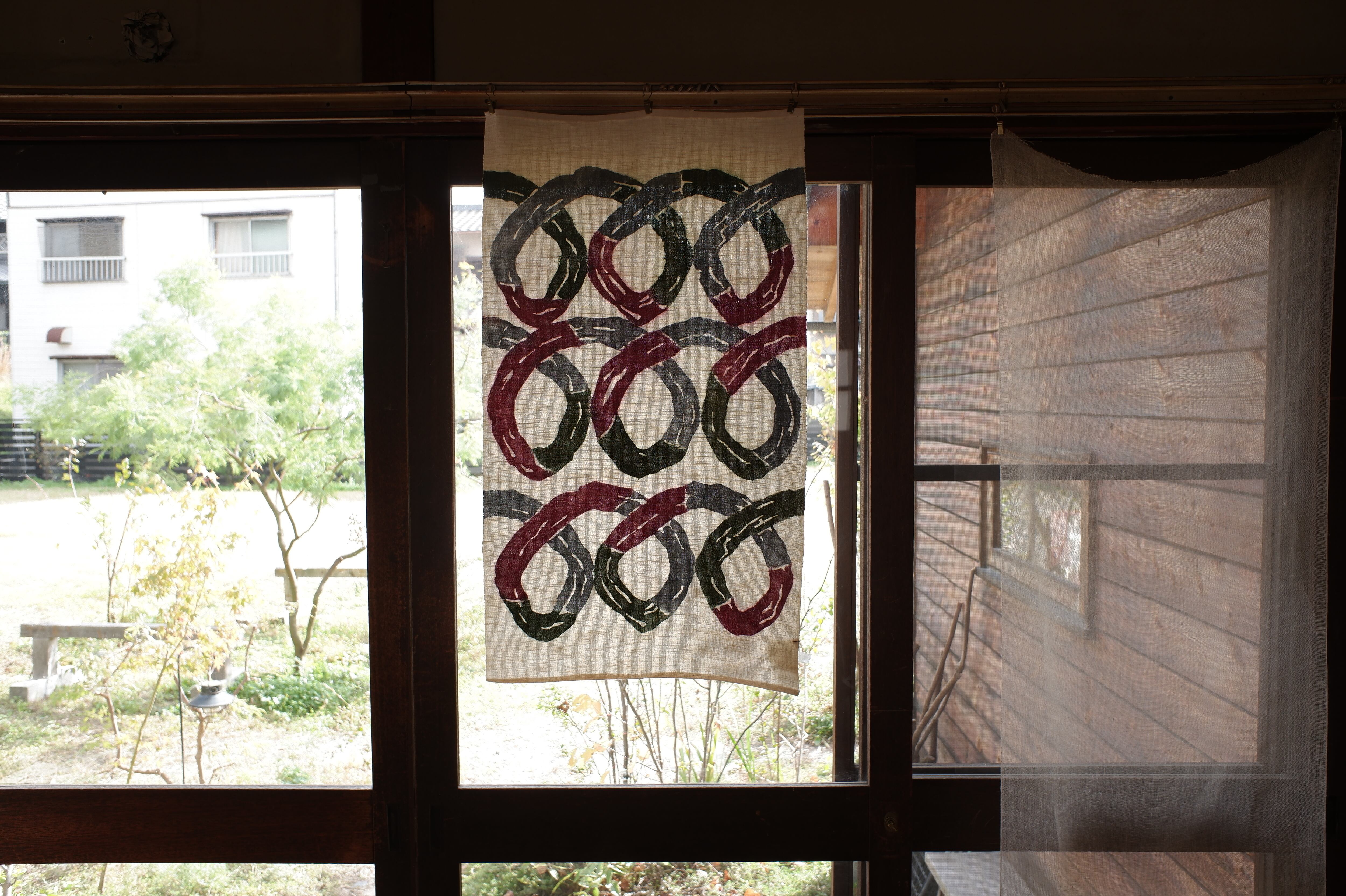 色々と楽しんでいただけたら嬉しいので、生地としてもお使いいただけるよう、仕立て(まわりの縫代になりそうなところをカットしたり、筒縫いをしてタペストリー専用に吊るす部分を作っていないということ)をあえてしてない型染め生地として作られています。