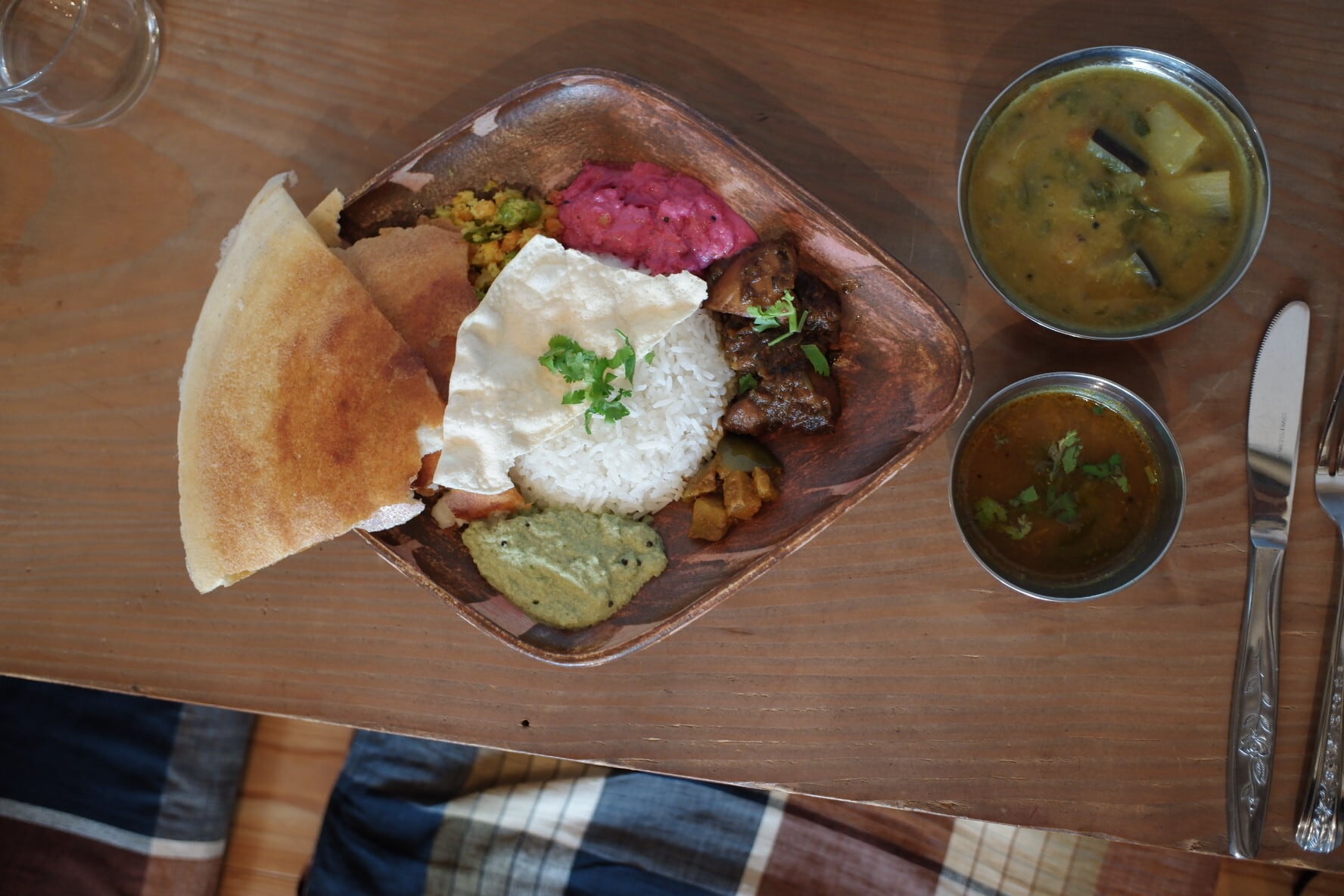 お料理を盛り付けて食卓の真ん中に、一人分のカレーやパスタを、果物鉢として。