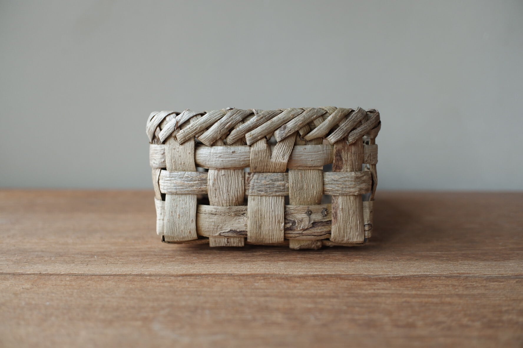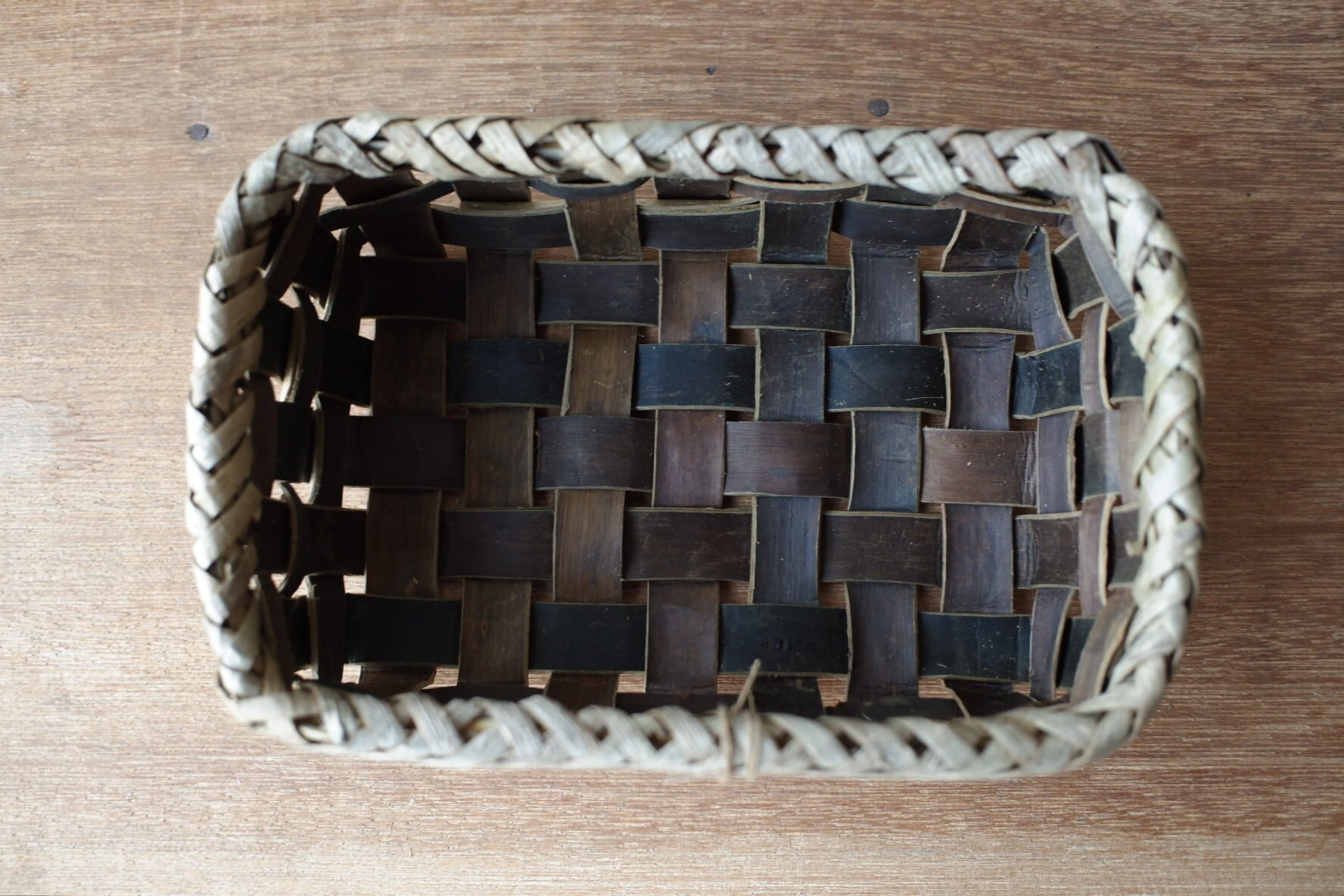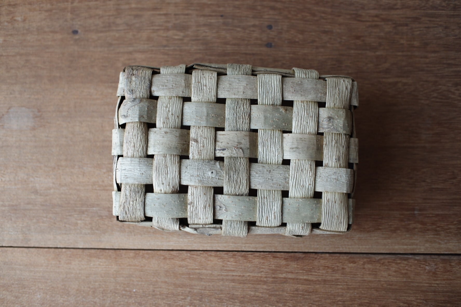 こちらの小さなかごは、沢胡桃樹皮の表皮を市松模様に編んだもの。
