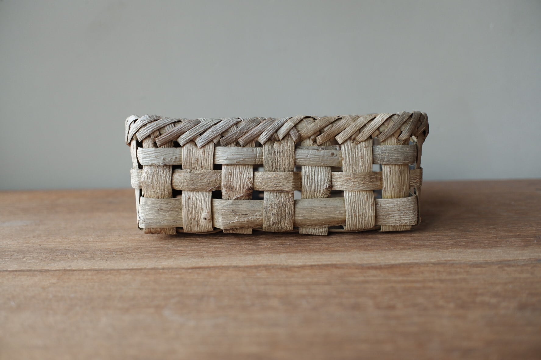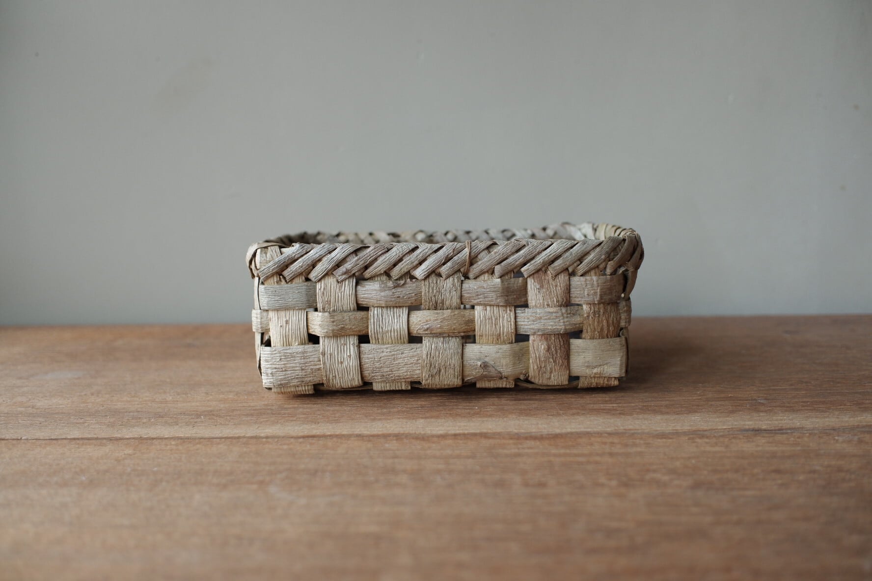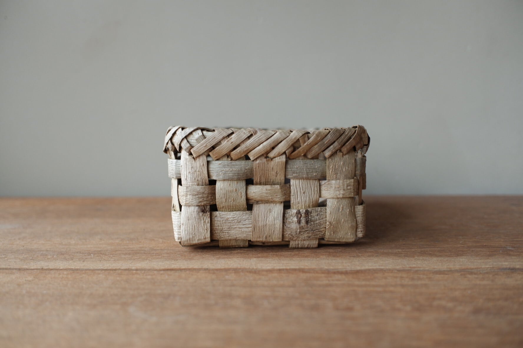 こちらの小さなかごは、沢胡桃樹皮の表皮を市松模様に編んだもの。