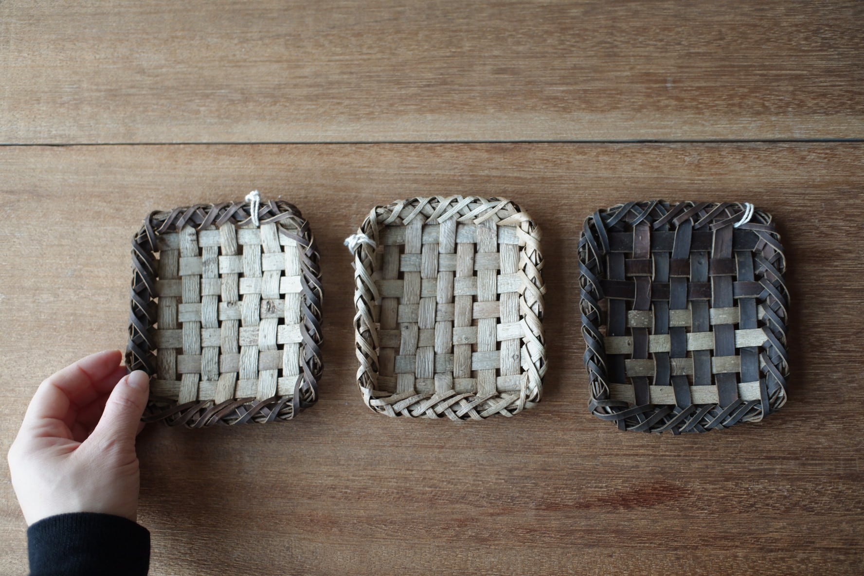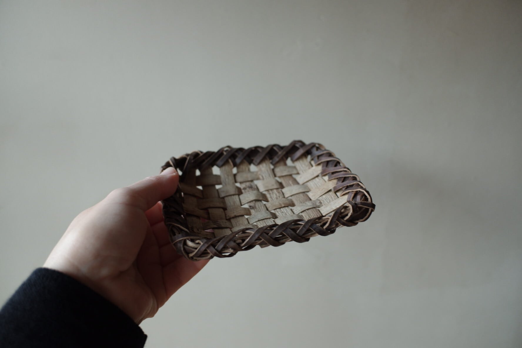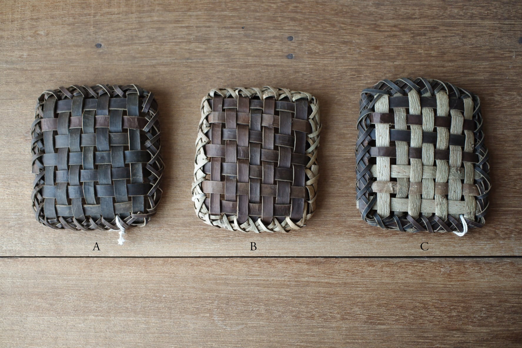 こちらは、沢胡桃樹皮の表皮を市松模様に編んだもの。