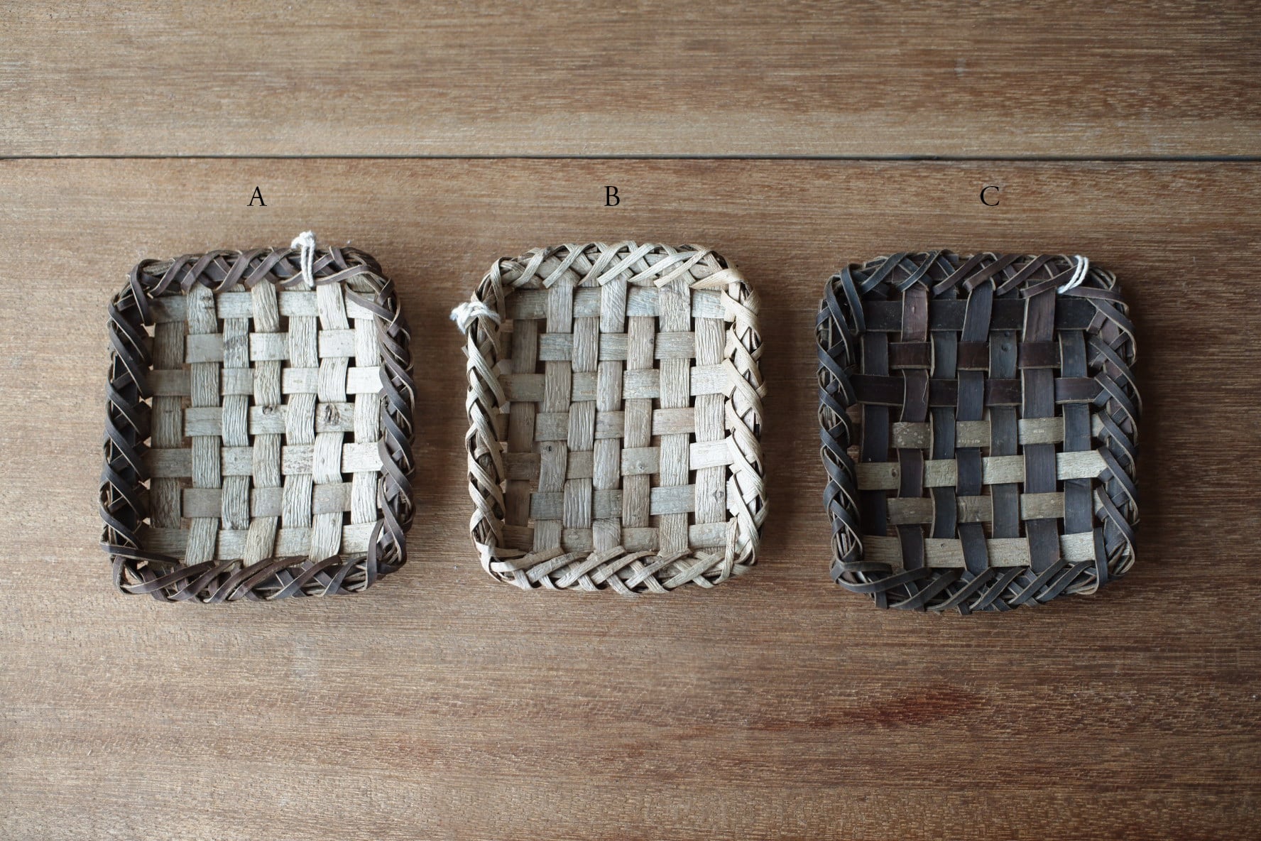 岩手県盛岡市で沢胡桃(さわぐるみ)の樹皮、アケビや山葡萄の蔓を使い、かごを作られているオズのかごバッグ 佐々木敏夫さんの、トレイ【 A・B・C 】です。