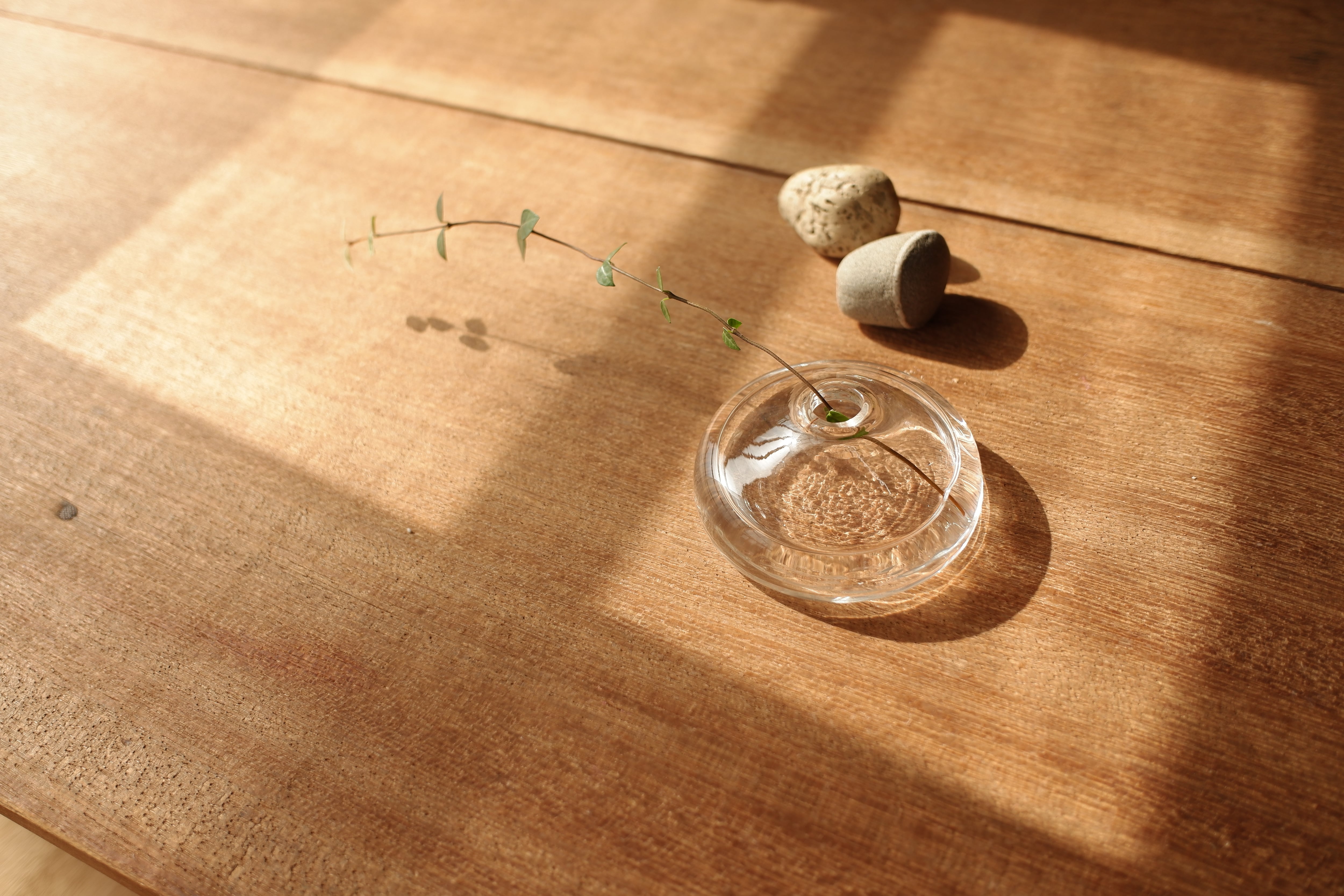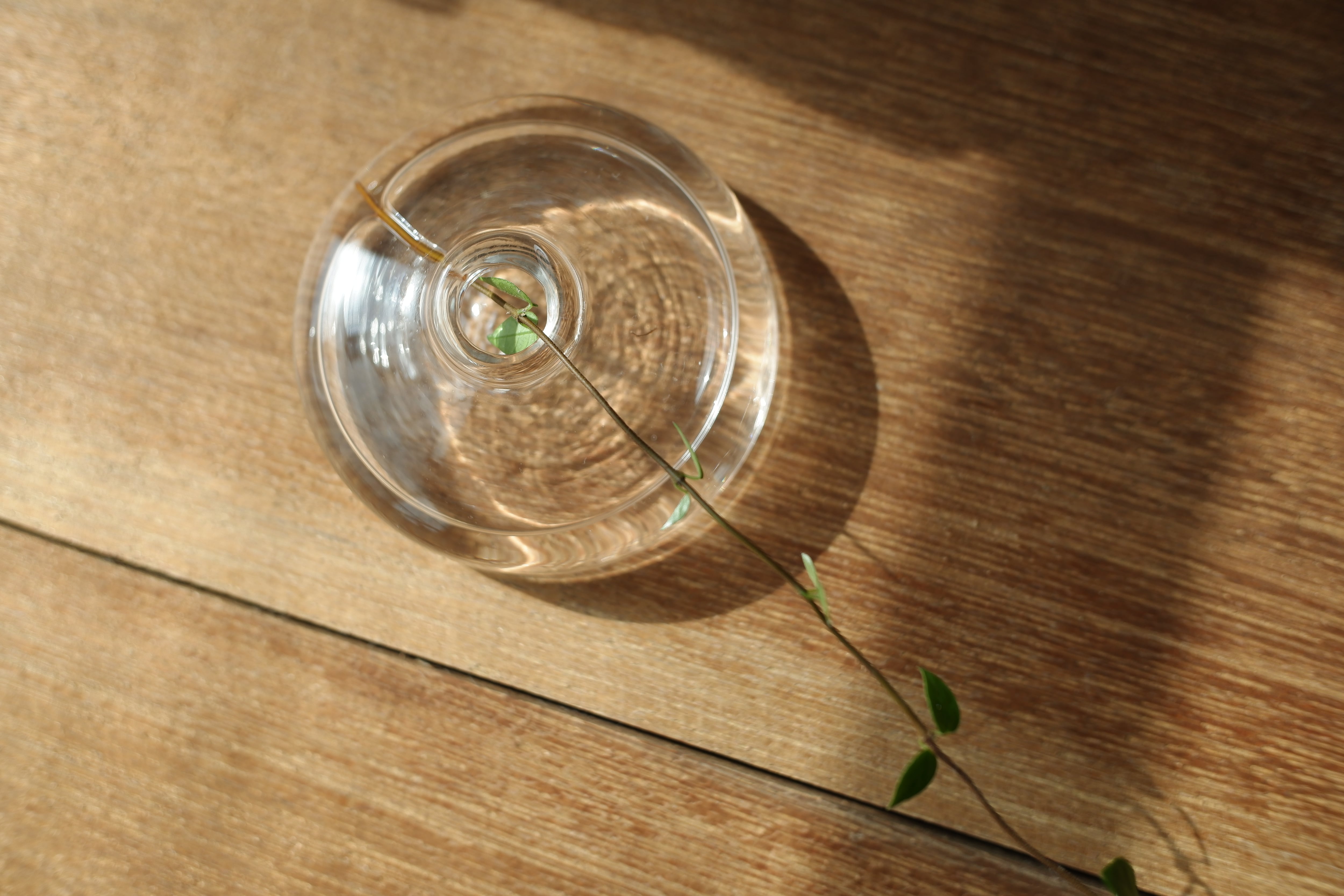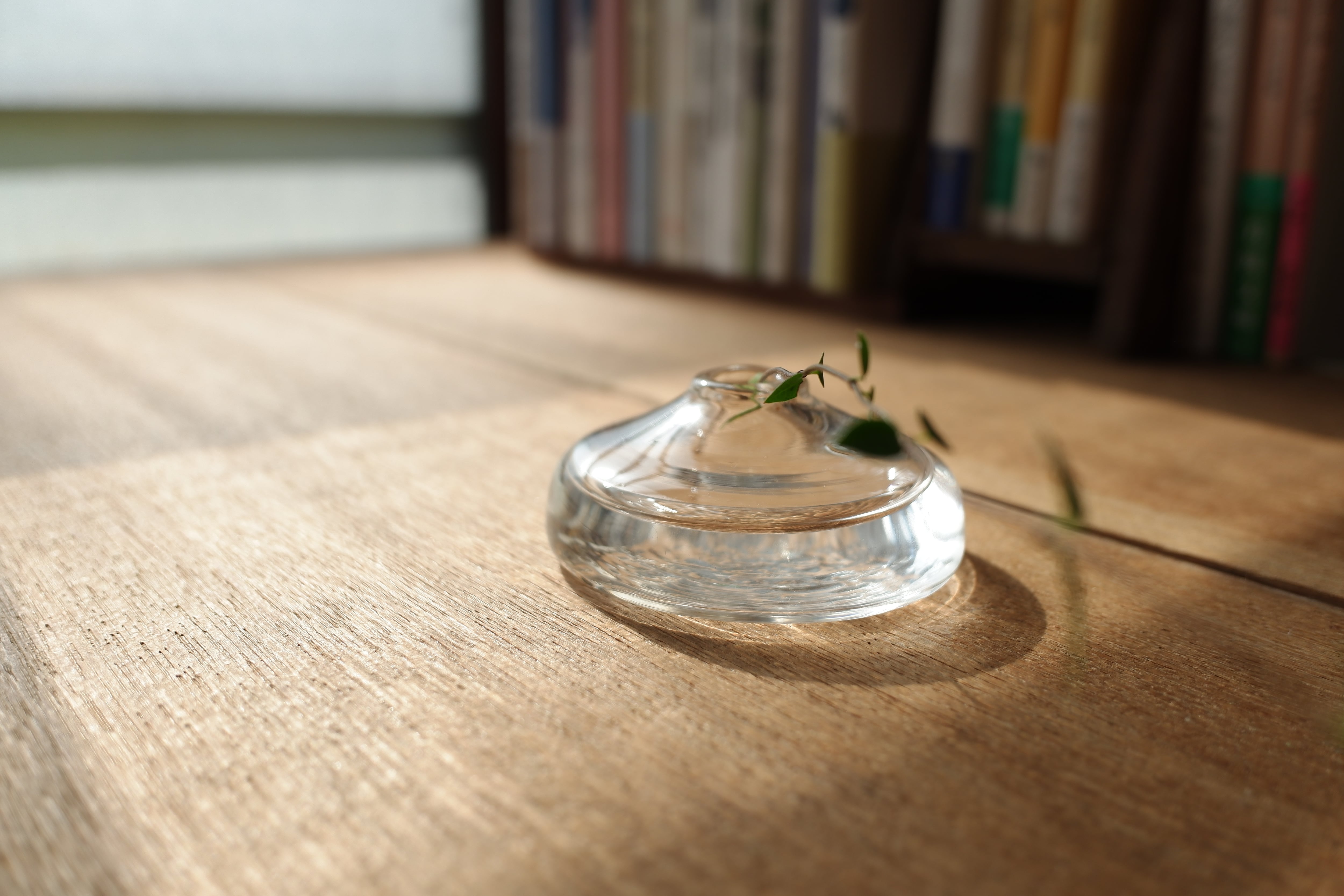 ぽてっとした形が可愛らしく、水を入れると光と水のゆらめきがテーブルに映りとても綺麗です。