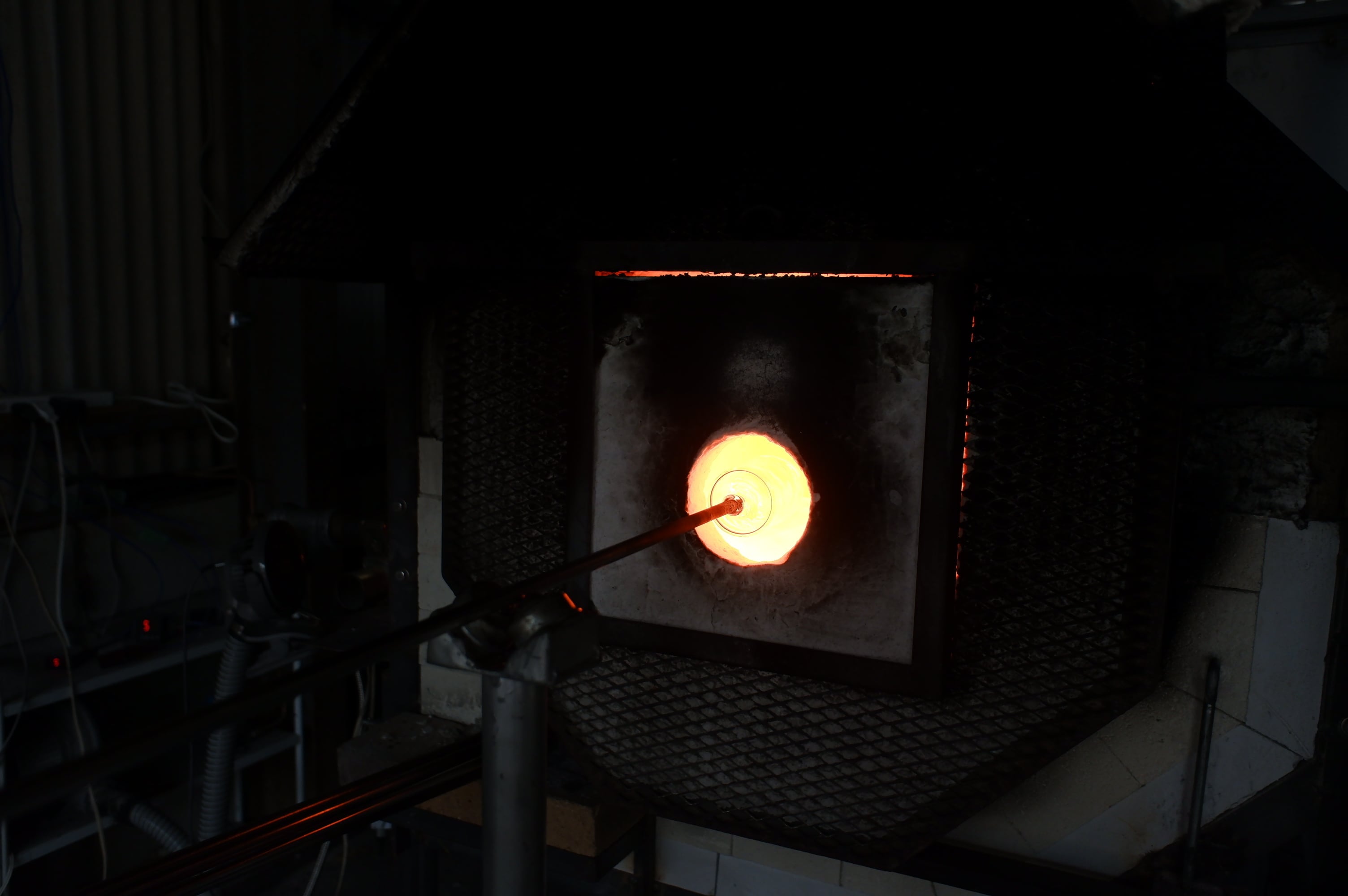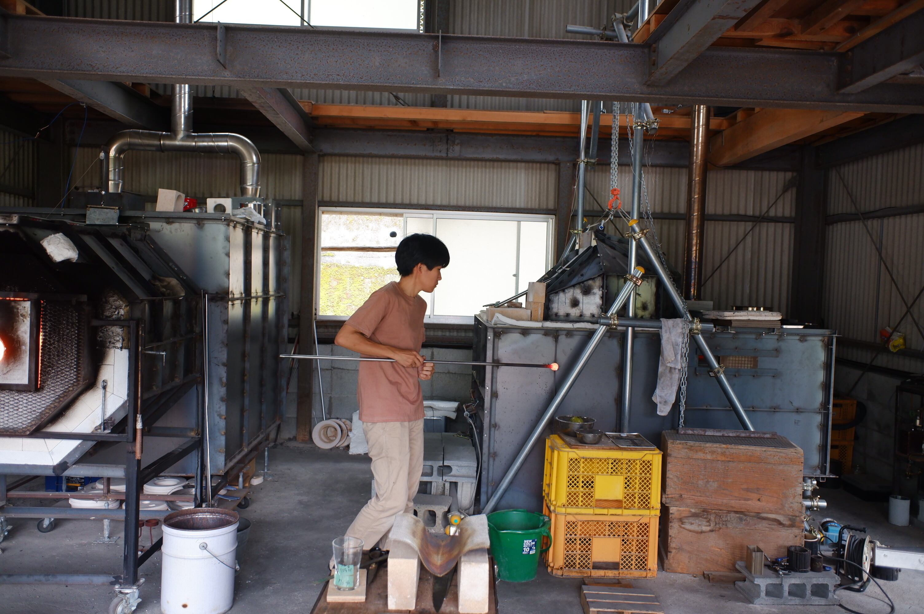 工房におじゃますると、ガラスを溶かすための炉と熱を加えるための炉がふたつ。