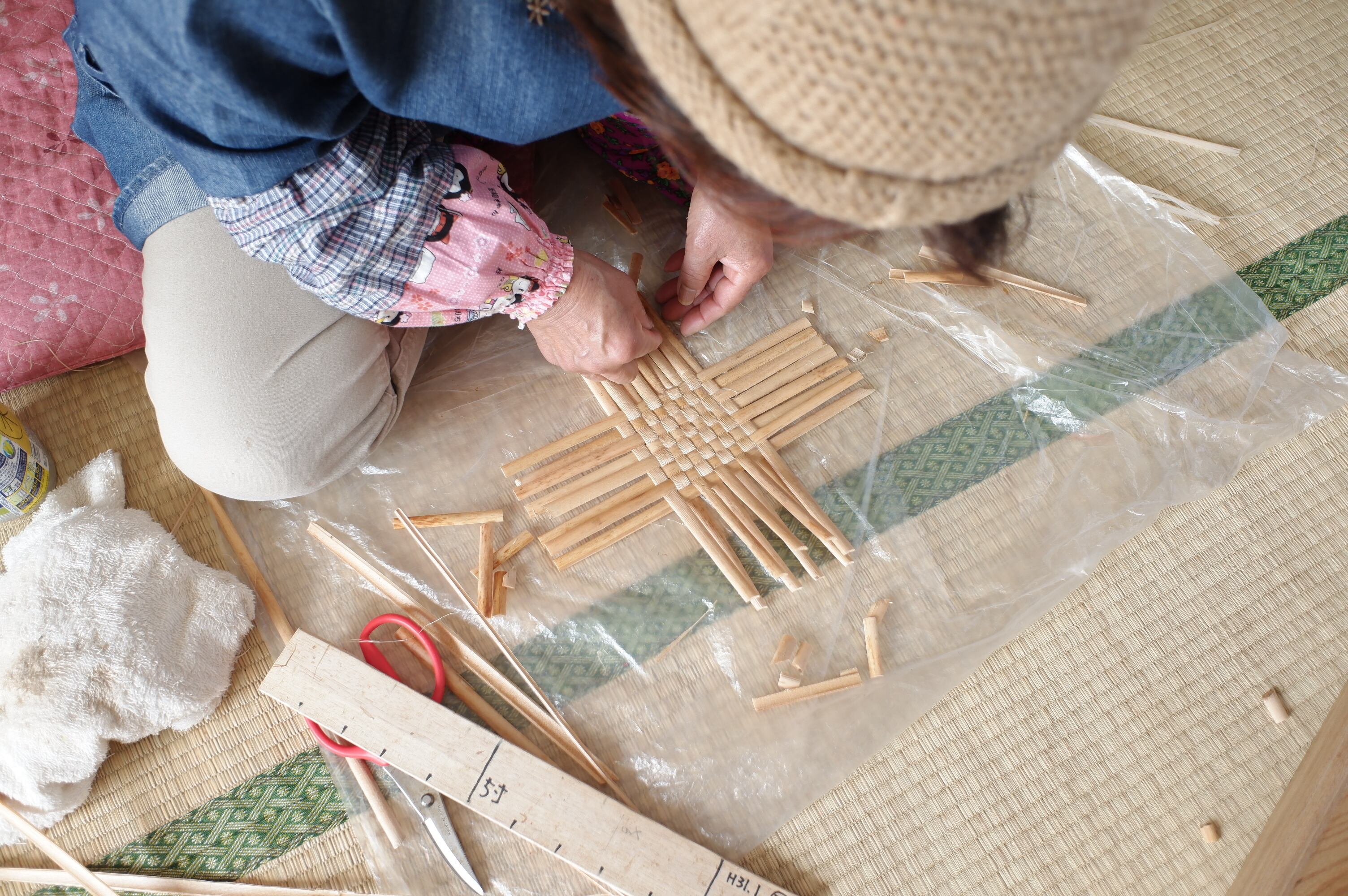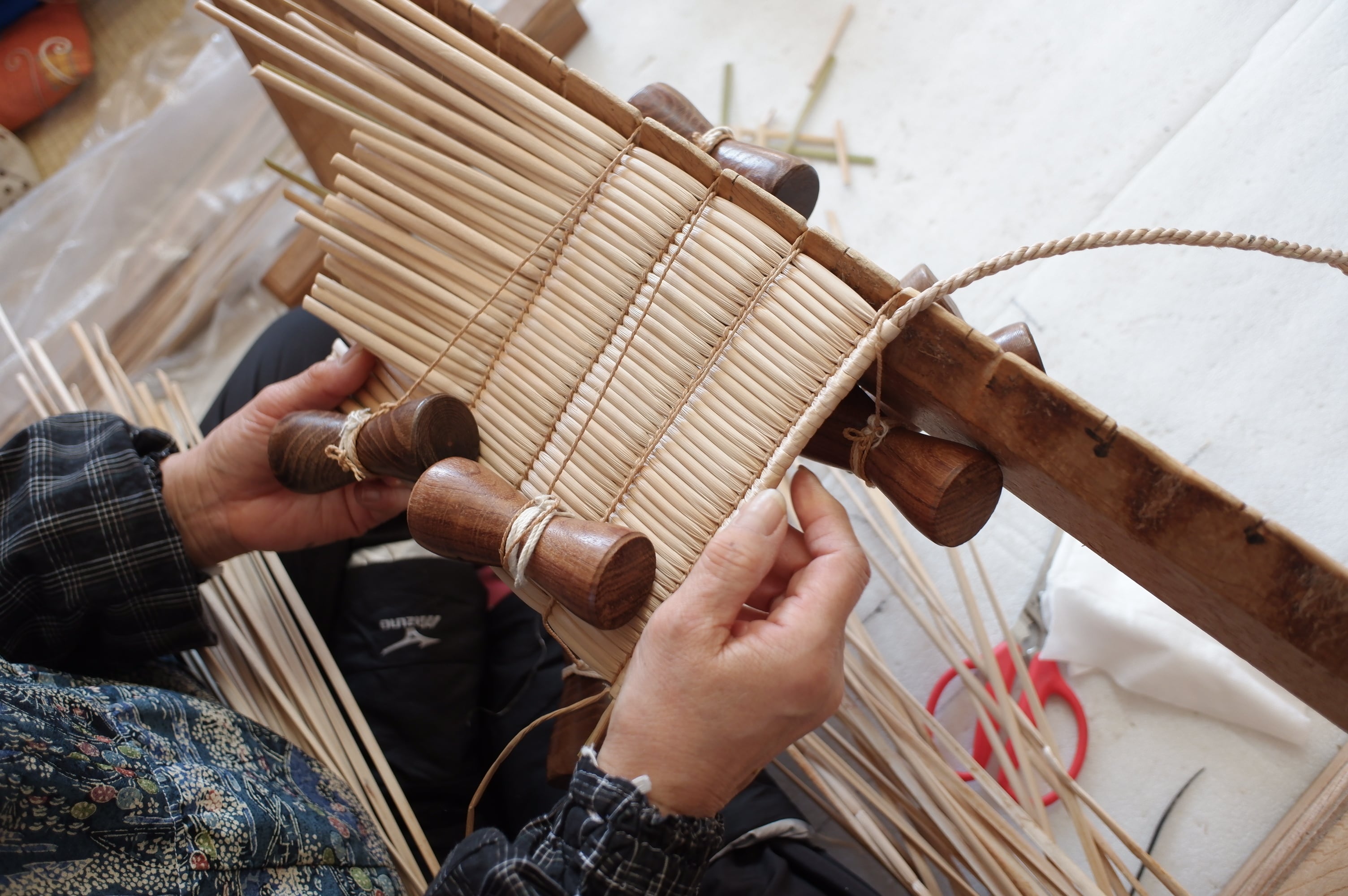 楽しそうな雰囲気とは裏腹に、がま細工を作る作業はとても大変で、長年作られて指の形が変わってきてしまったり、同じ姿勢の作業に体のあちこちが痛くなったり。