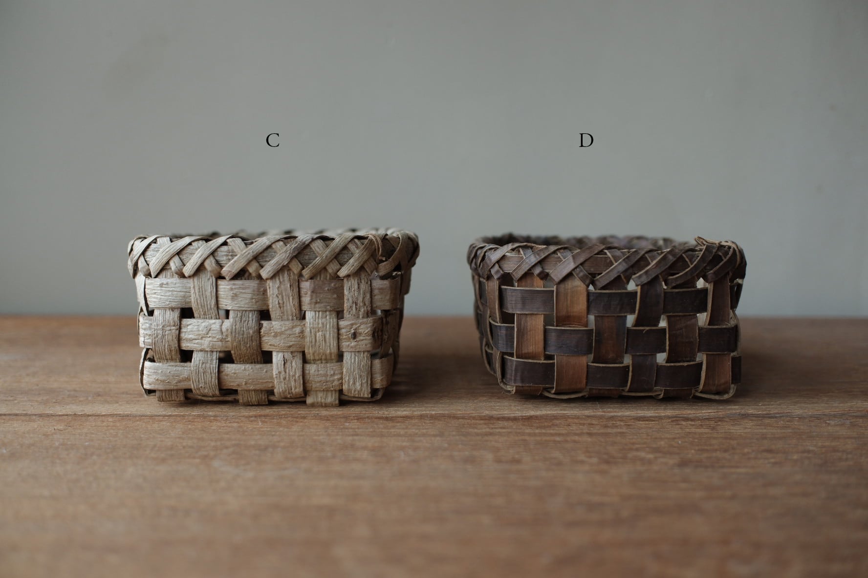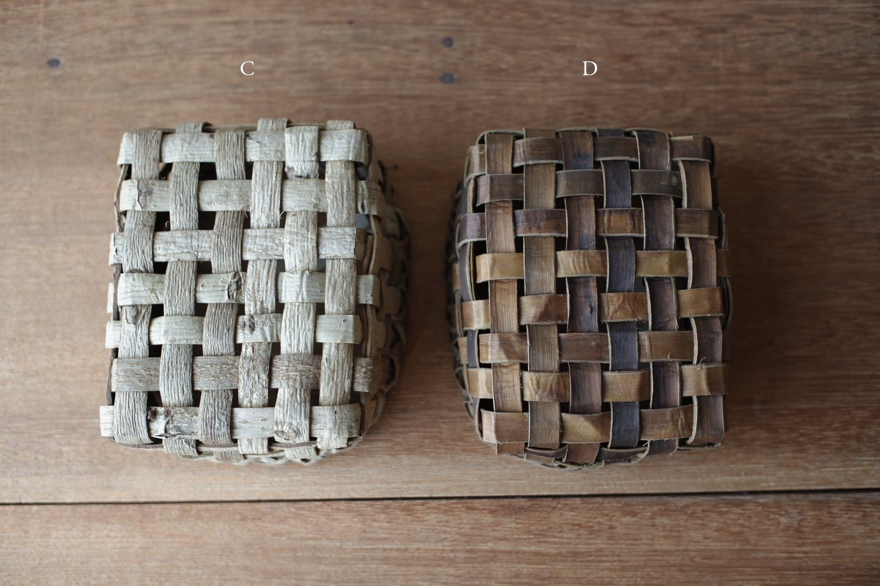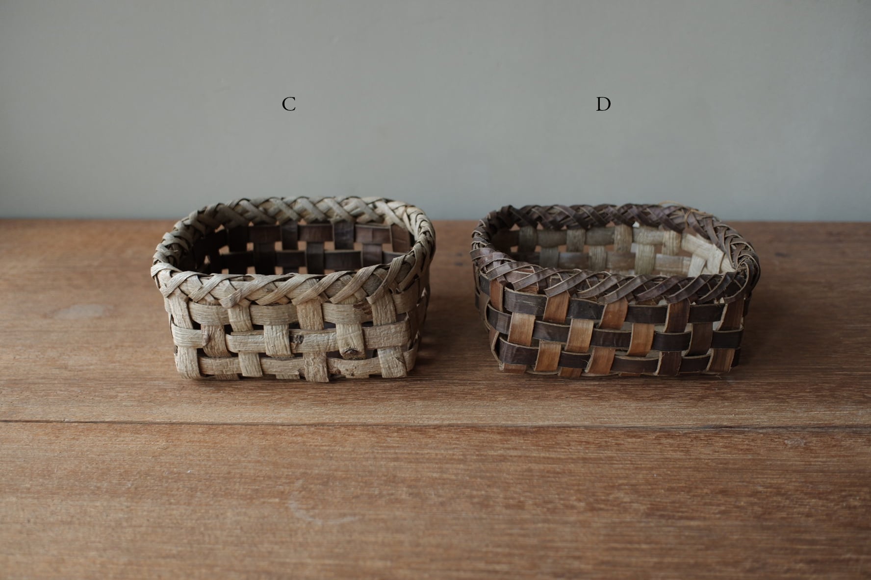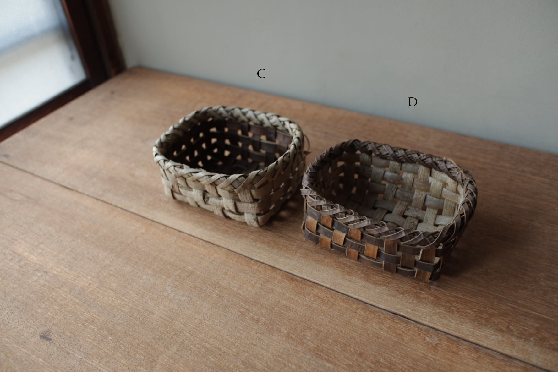 岩手県盛岡市で沢胡桃(さわぐるみ)の樹皮、アケビや山葡萄の蔓を使い、かごを作られているオズのかごバッグ 佐々木敏夫さんの、小物入れかご【 C・D 】です。