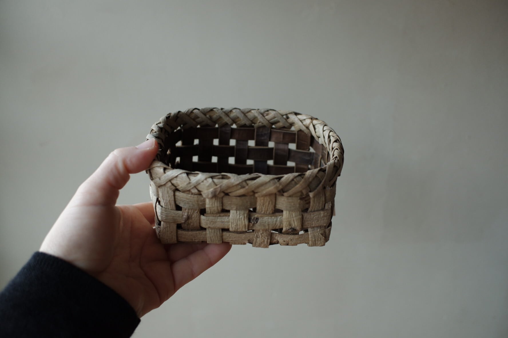 こちらの小さなかごは、沢胡桃樹皮の表皮を市松模様に編んだもの。