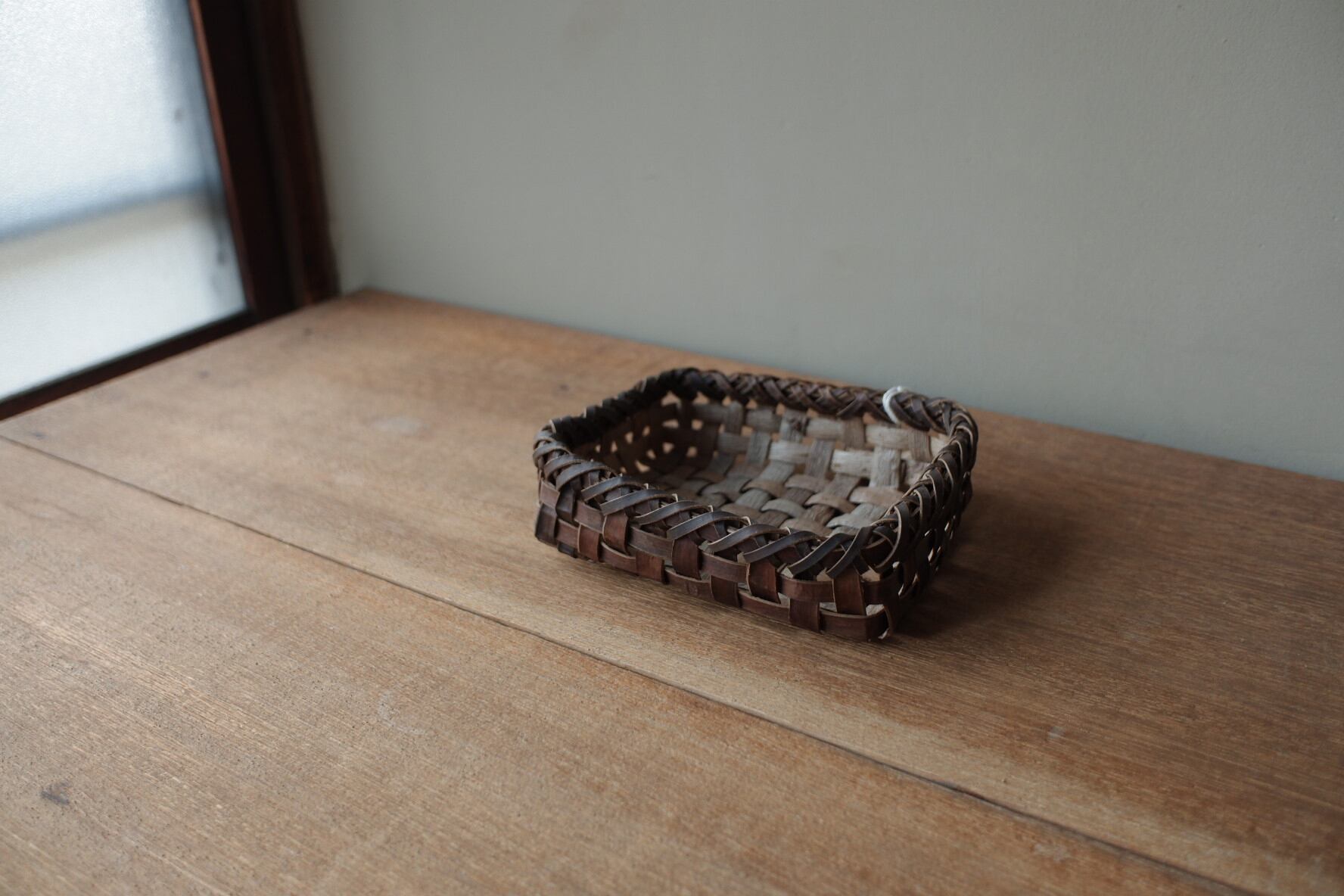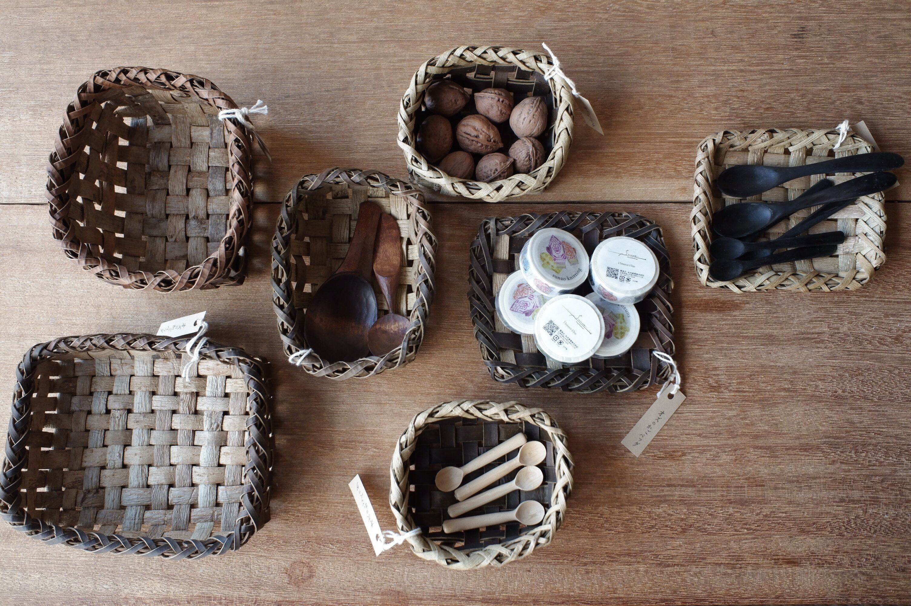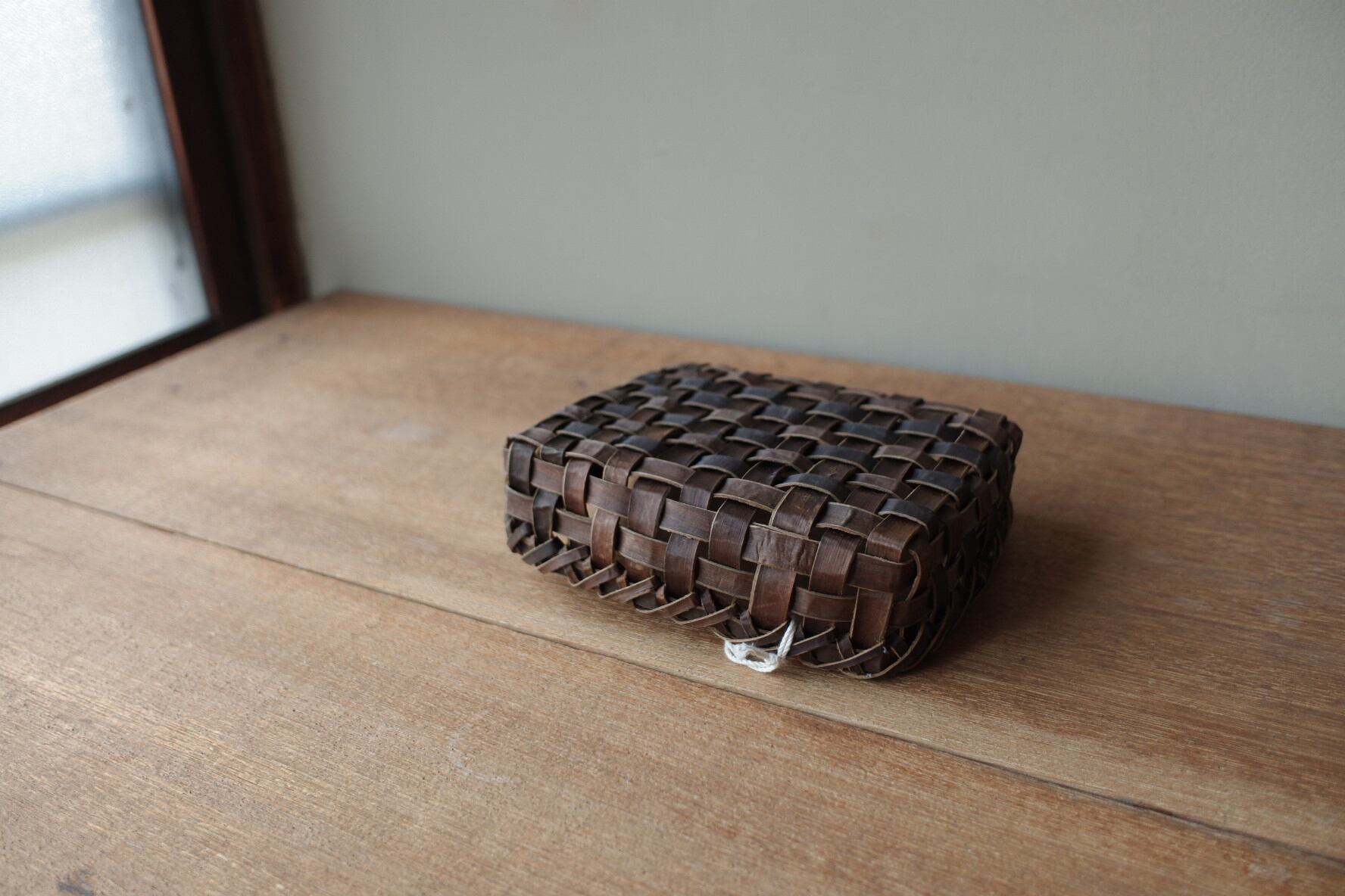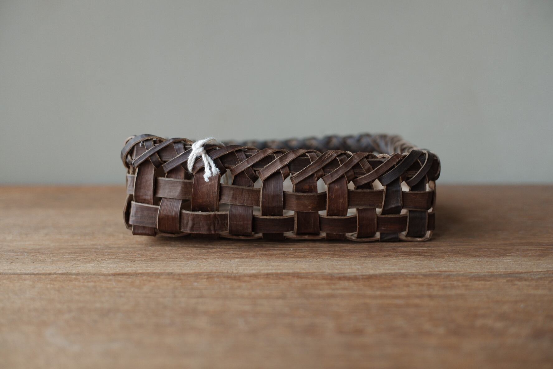 こちらの小さなかごは、沢胡桃樹皮の表皮を市松模様に編んだもの。