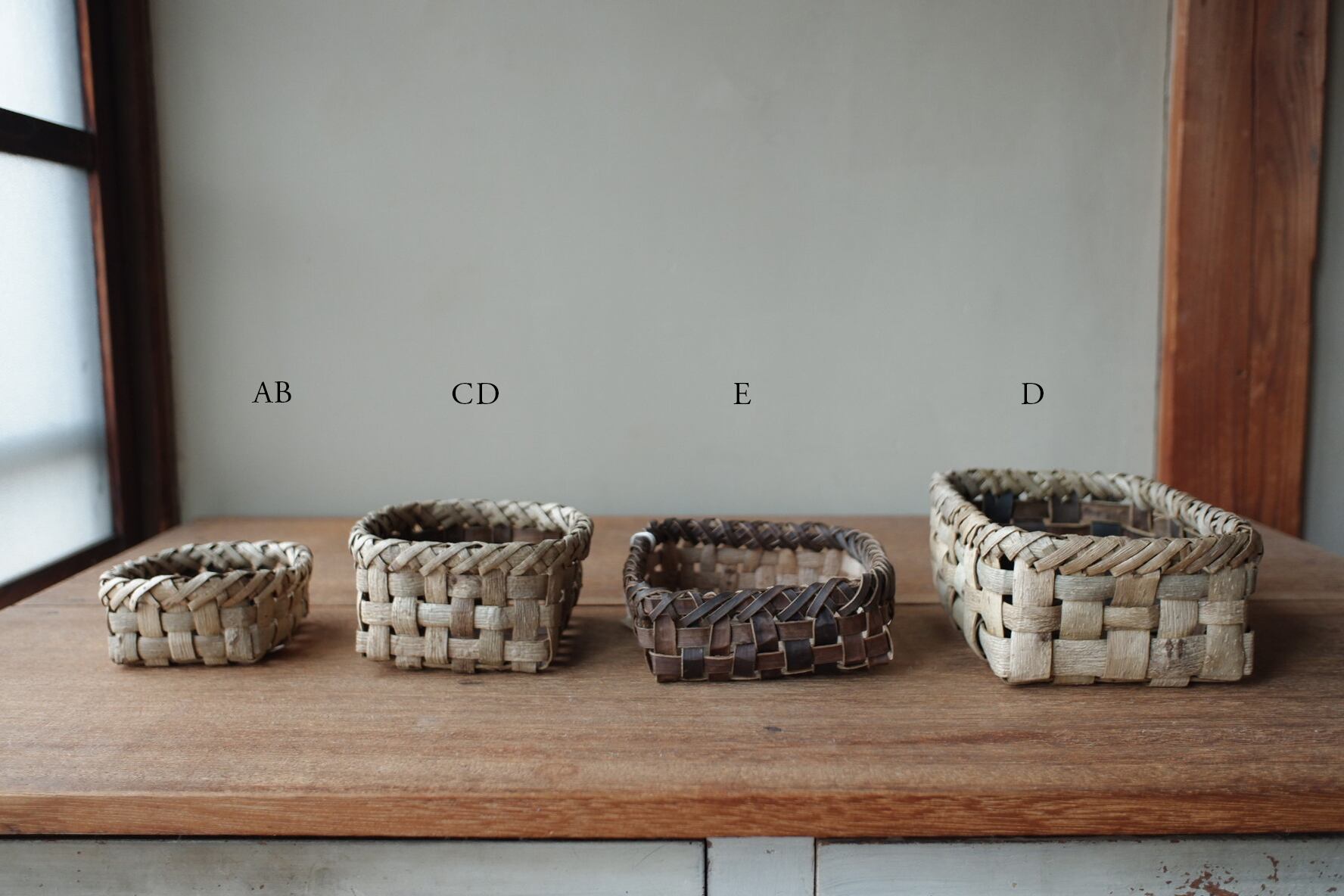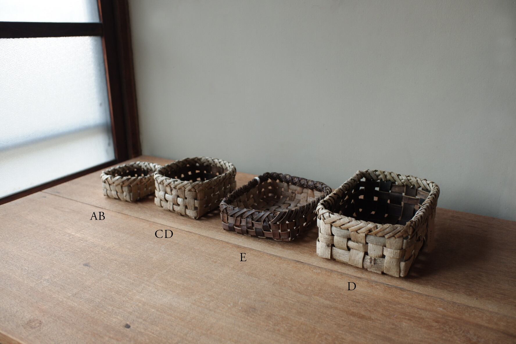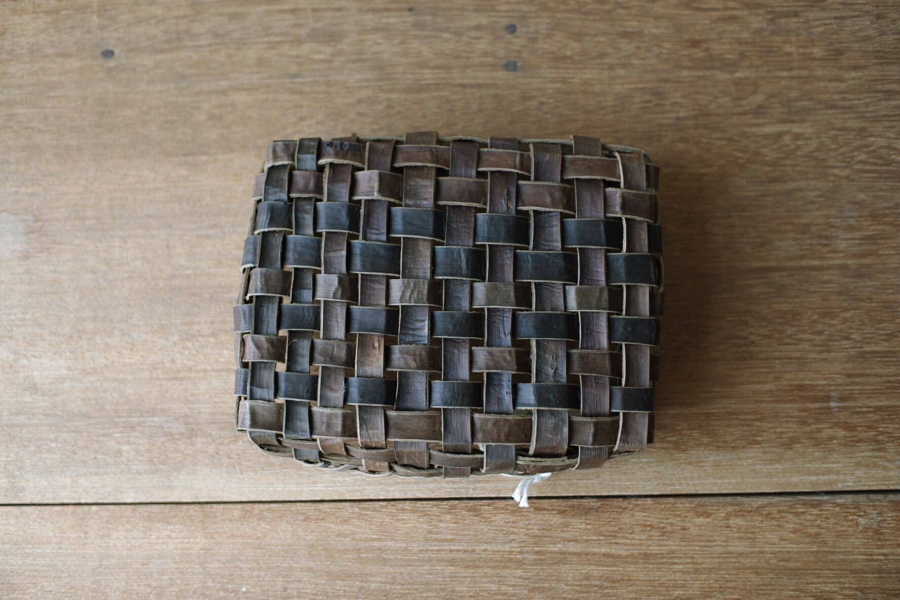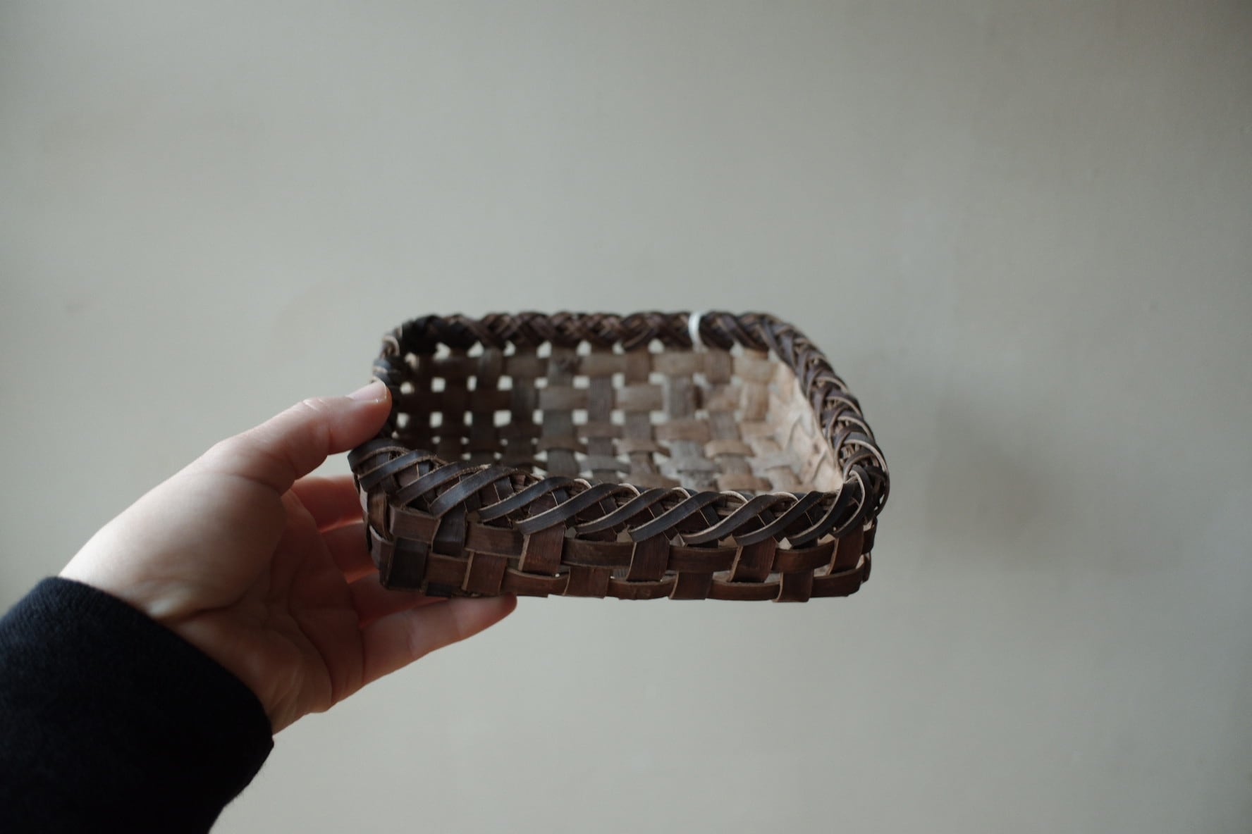 こちらの小さなかごは、沢胡桃樹皮の表皮を市松模様に編んだもの。