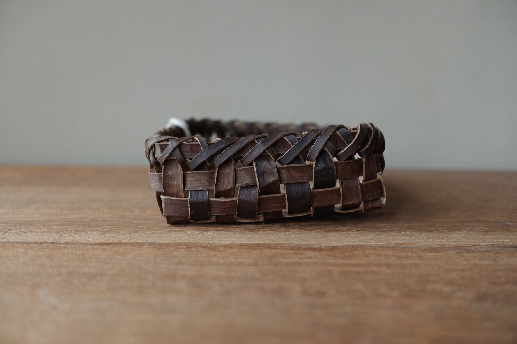 濃い色の部分は、同じ沢胡桃樹皮の裏を表にして編まれています。